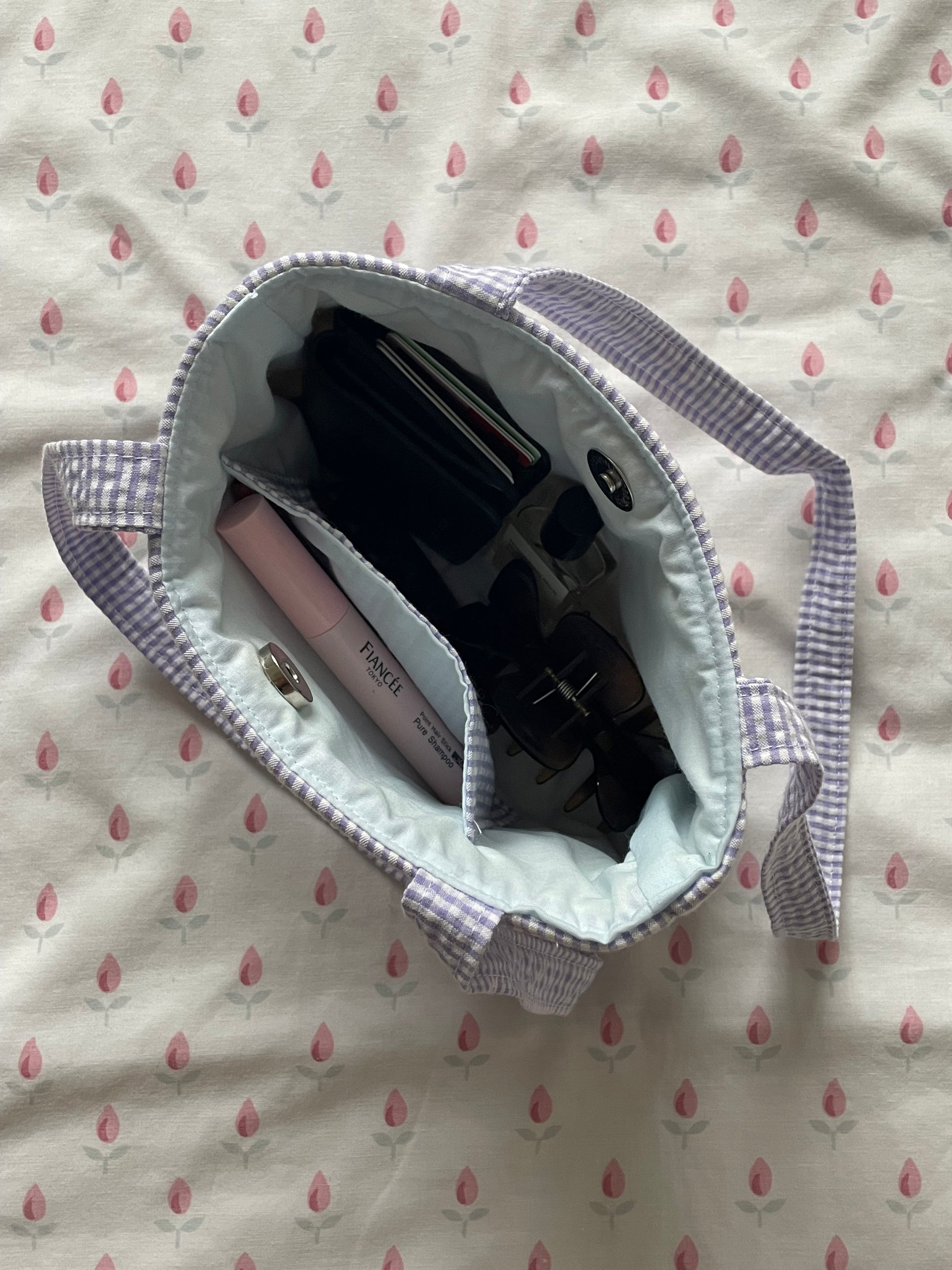 Made with vintage lilac gingham fabric and blue lining fabric.