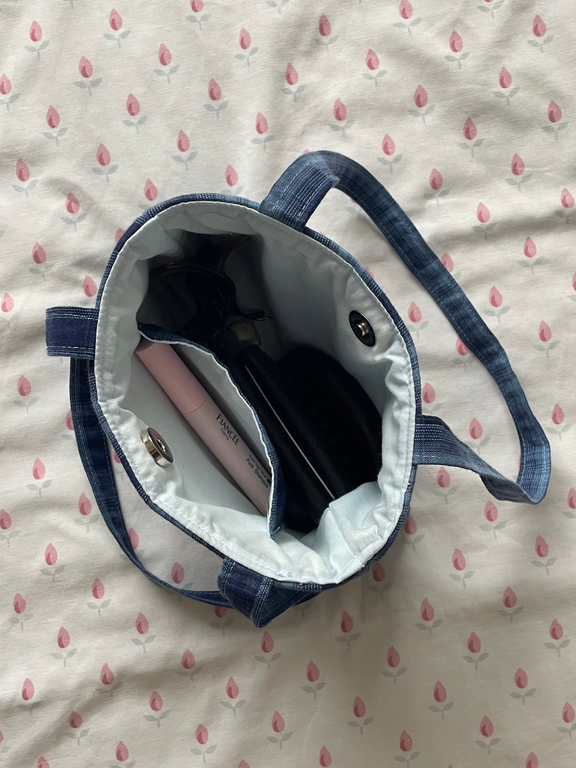 Made with up-cycled blue plaid fabric and blue lining fabric.