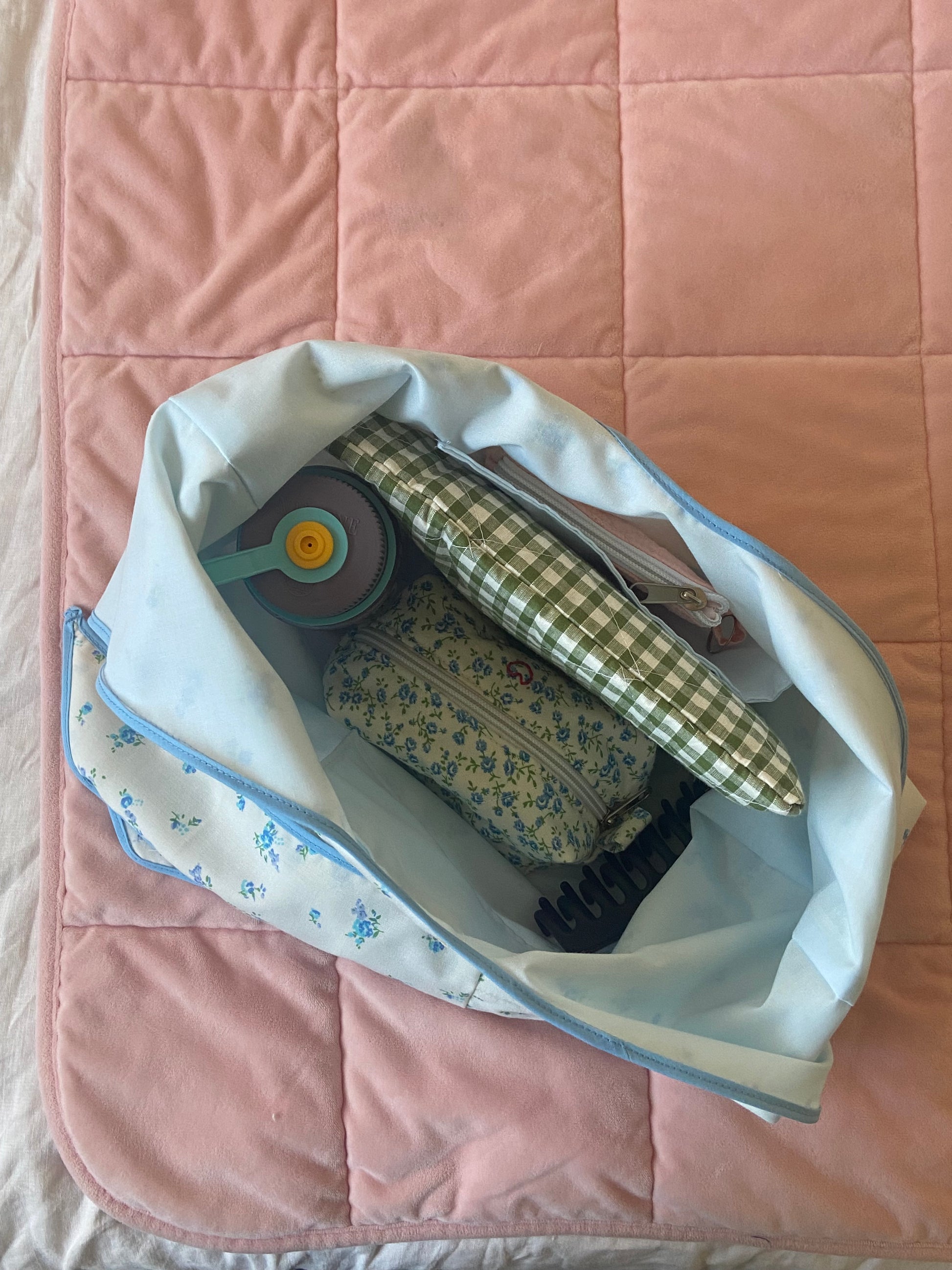 Made with vintage blue floral fabric, blue vintage binding, and blue lining fabric.