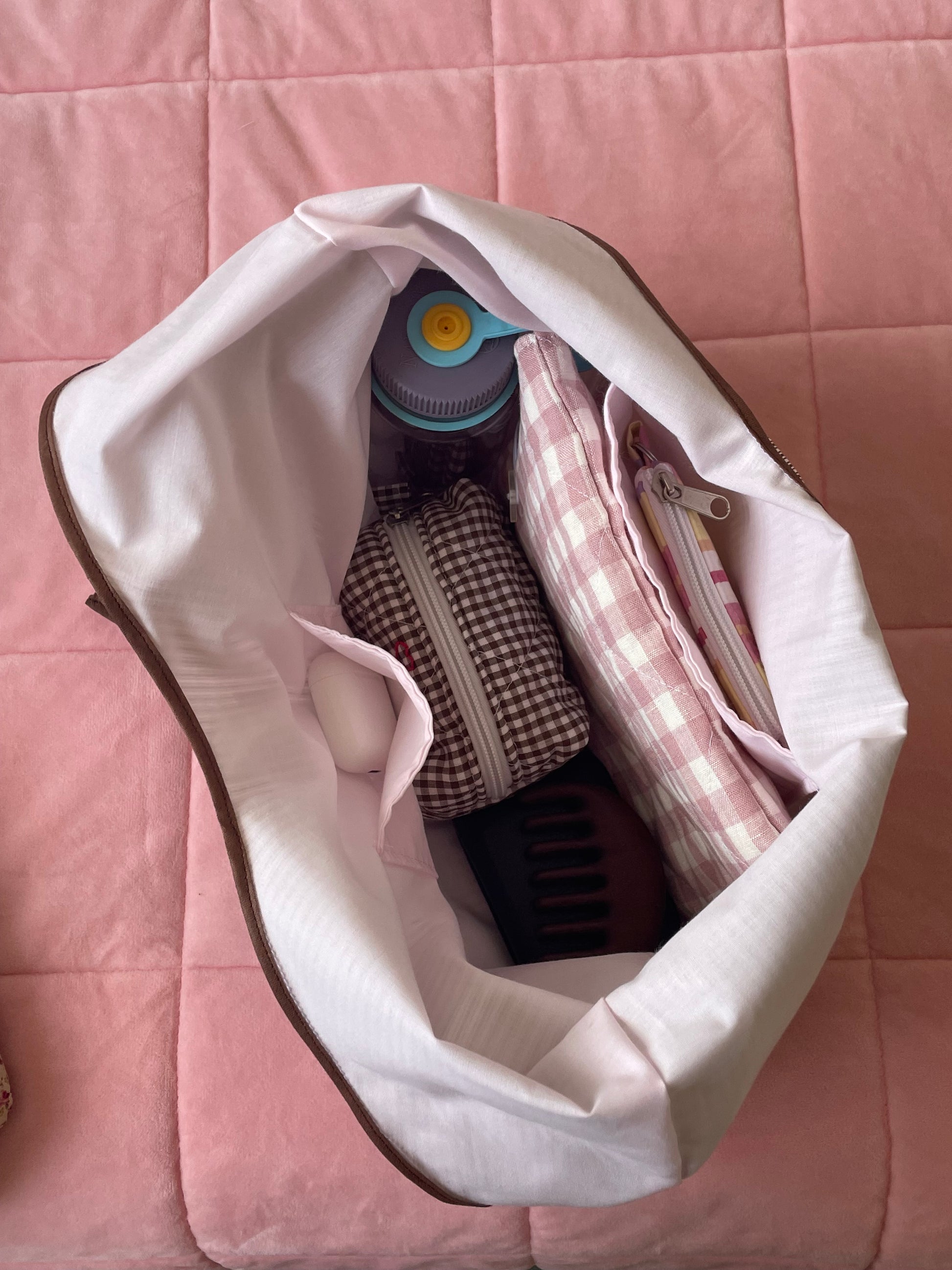 Made with up-cycled brown stripe fabric, brown vintage binding, and pink lining fabric.