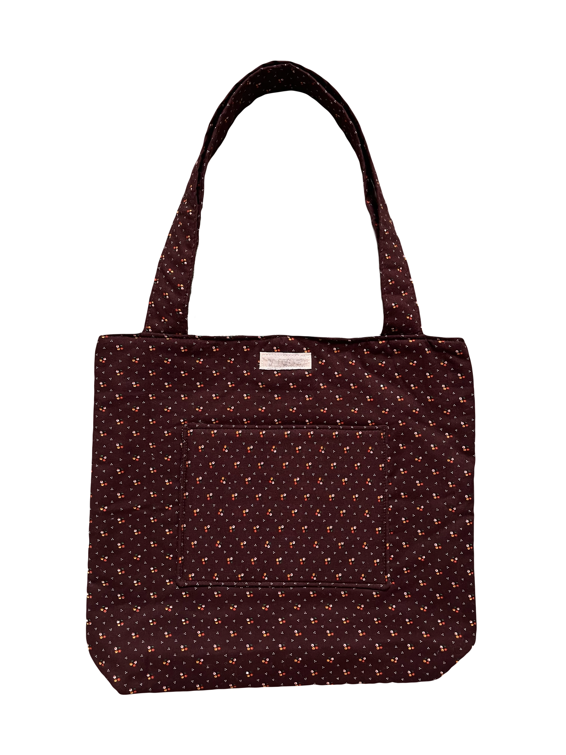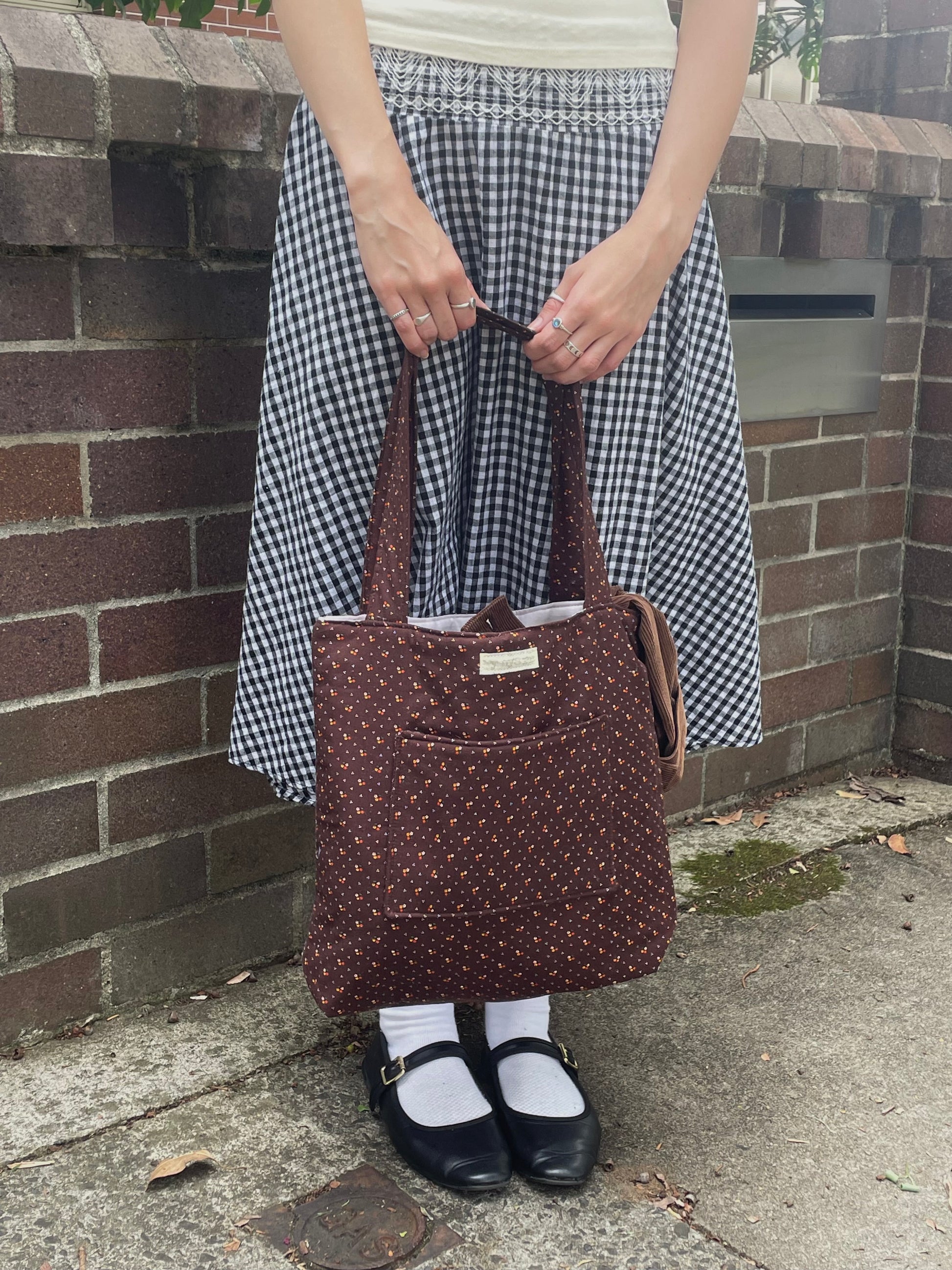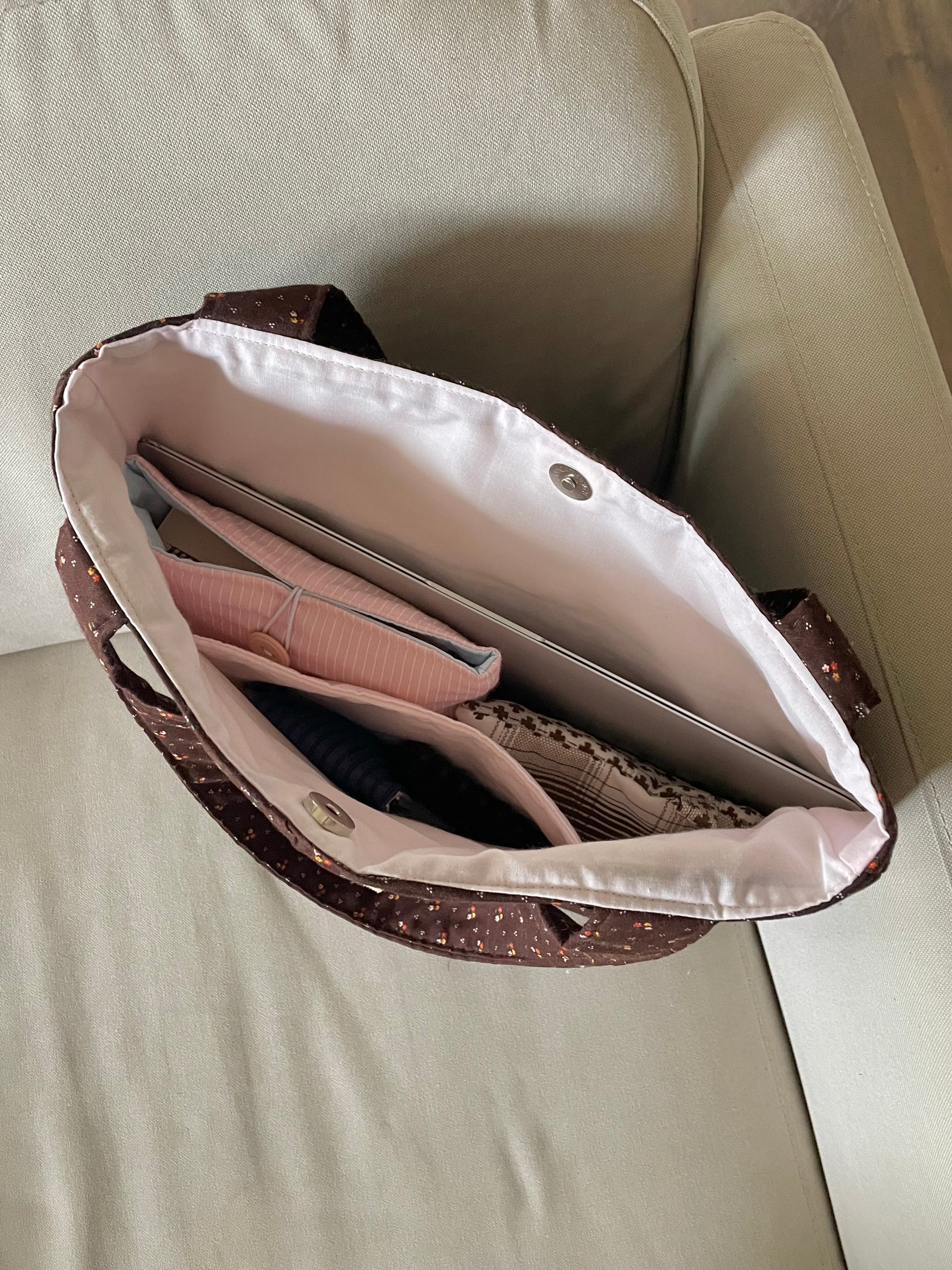 Made with up-cycled brown floral fabric and pink lining fabric.
