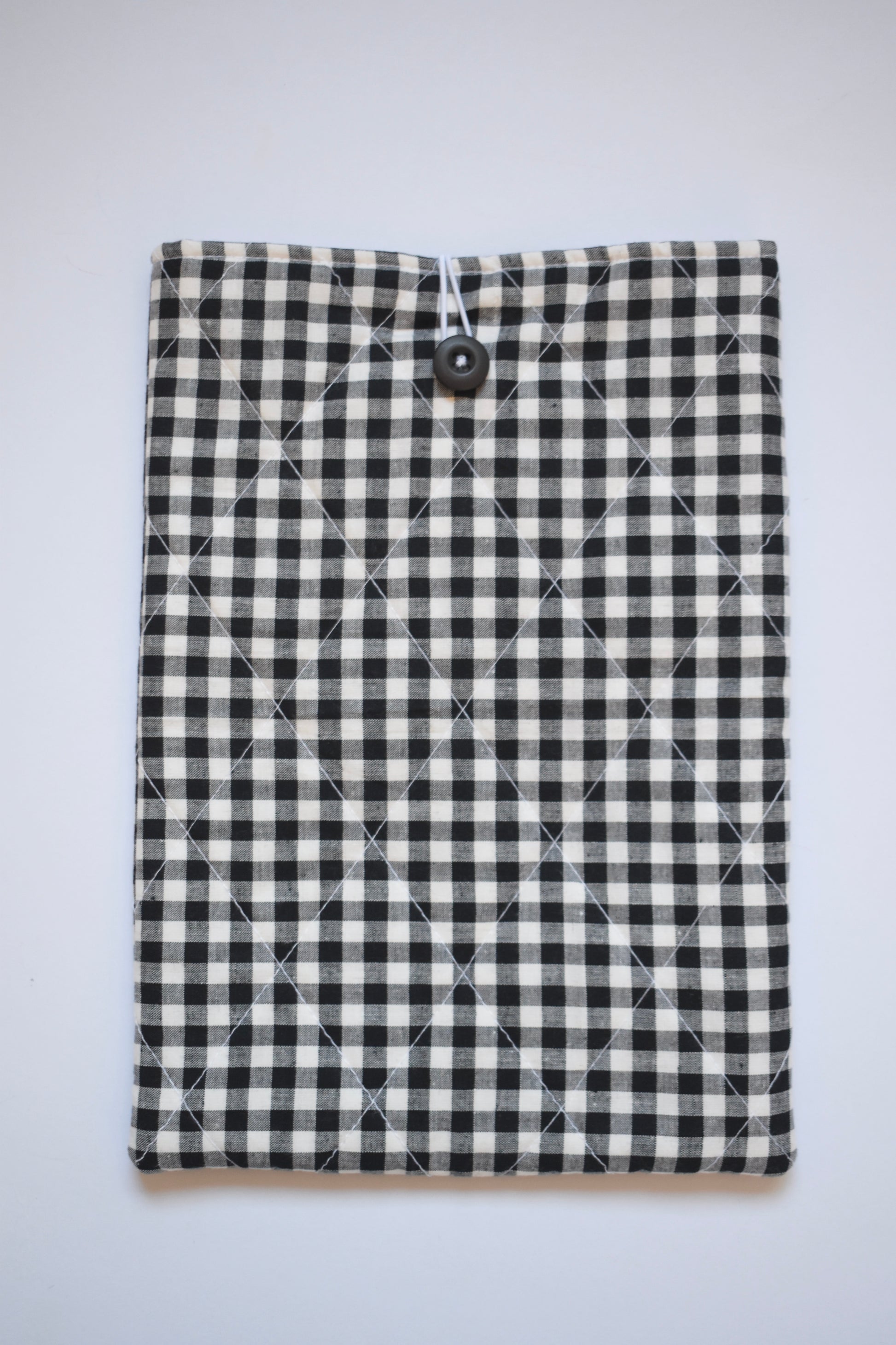 Made with up-cycled black gingham fabric and pink lining fabric.