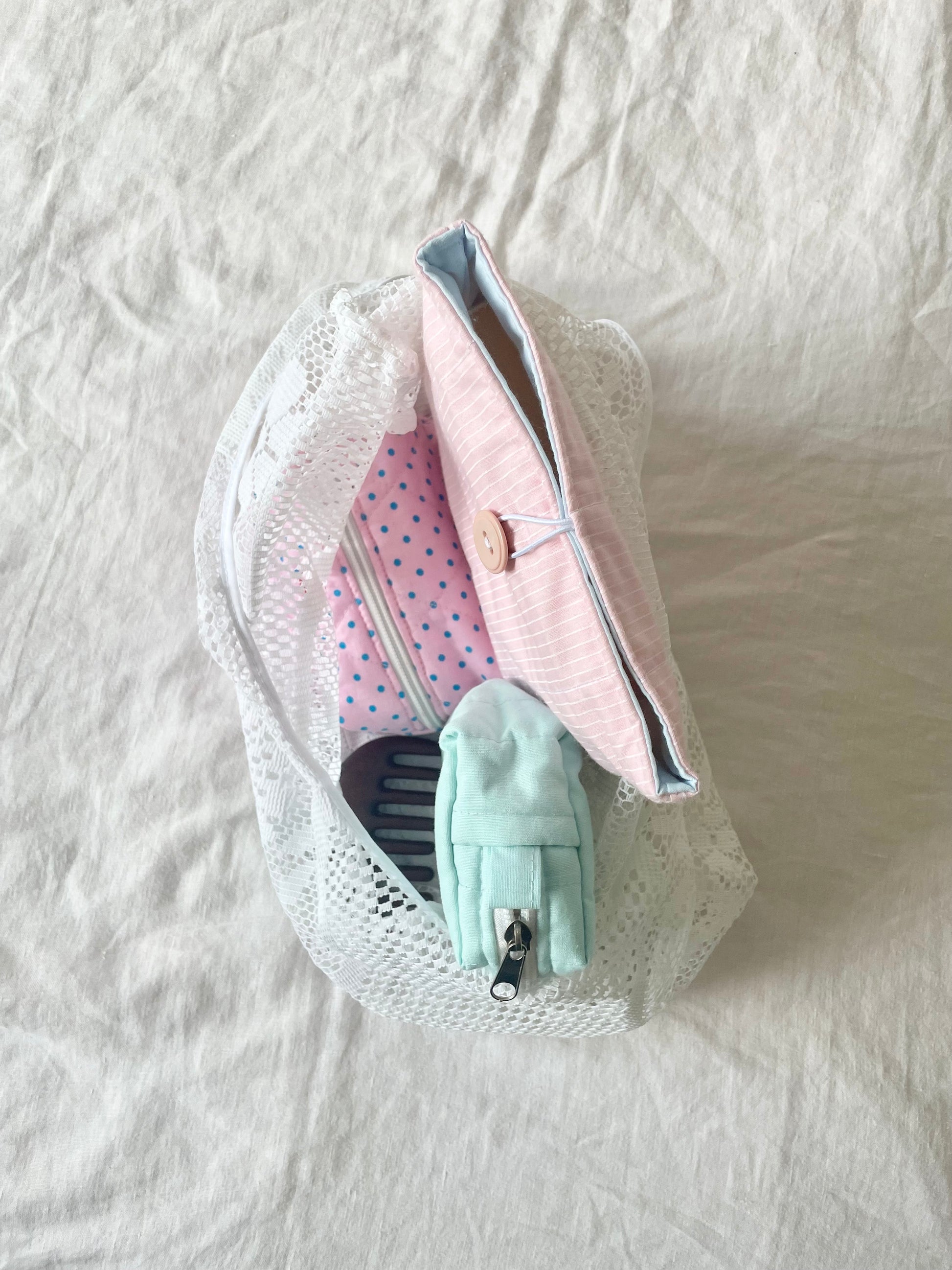 Made with a vintage tablecloth and white vintage binding.