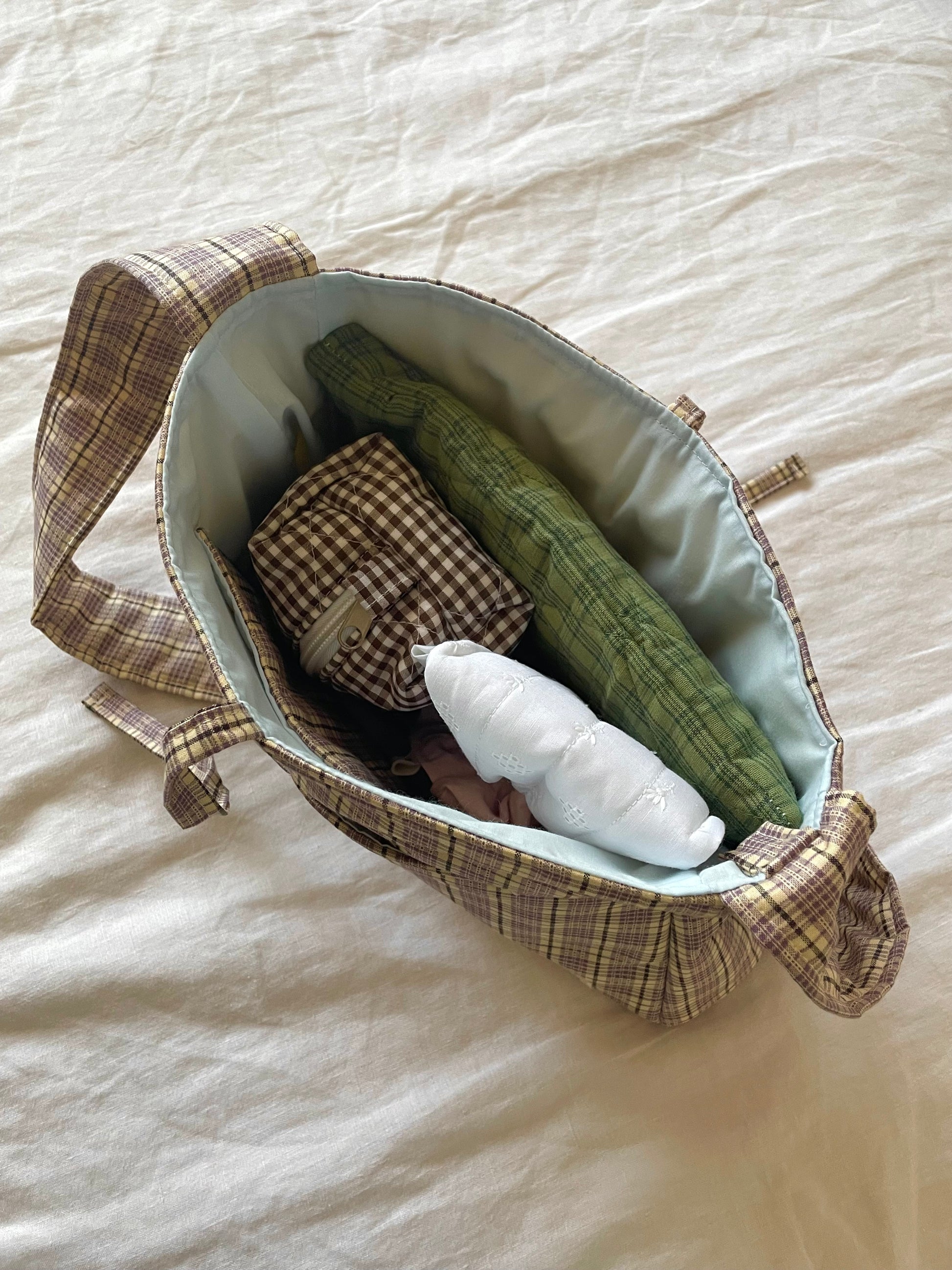 Made with up-cycled lilac check fabric and blue lining fabric.
