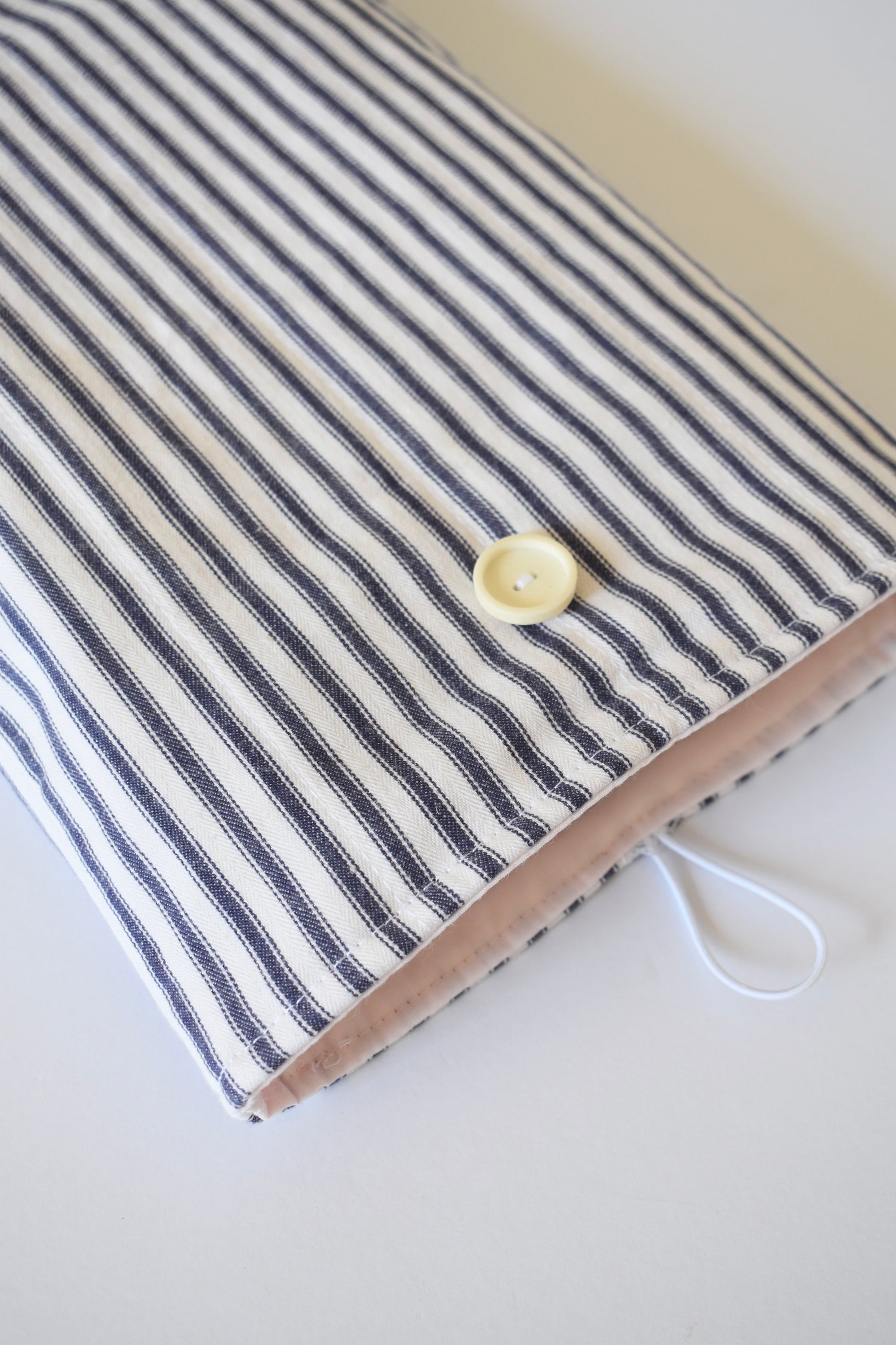 Made with up-cycled navy striped fabric and pink lining fabric.