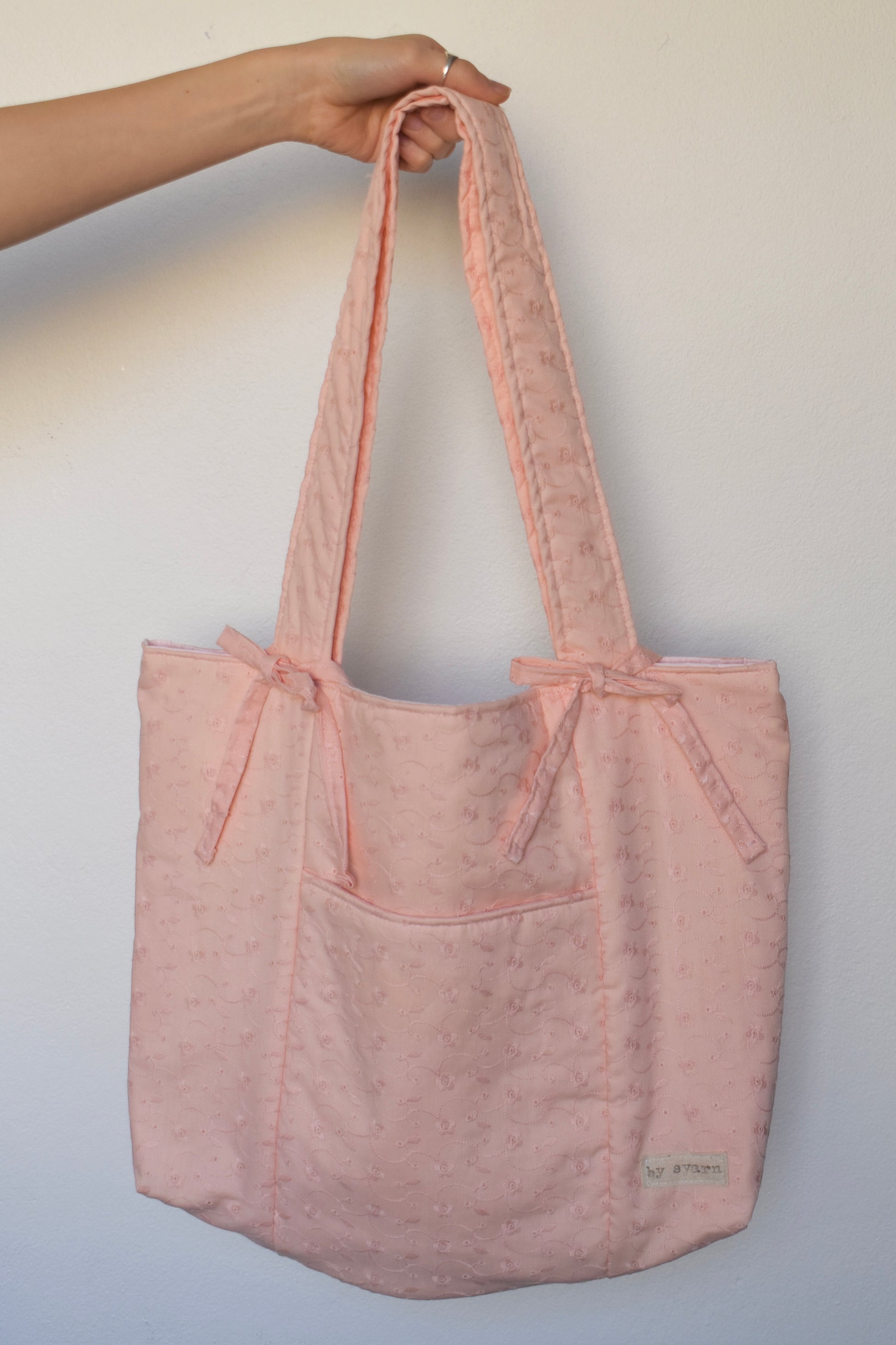 Made with vintage pink broderie anglaise fabric and pink lining fabric.