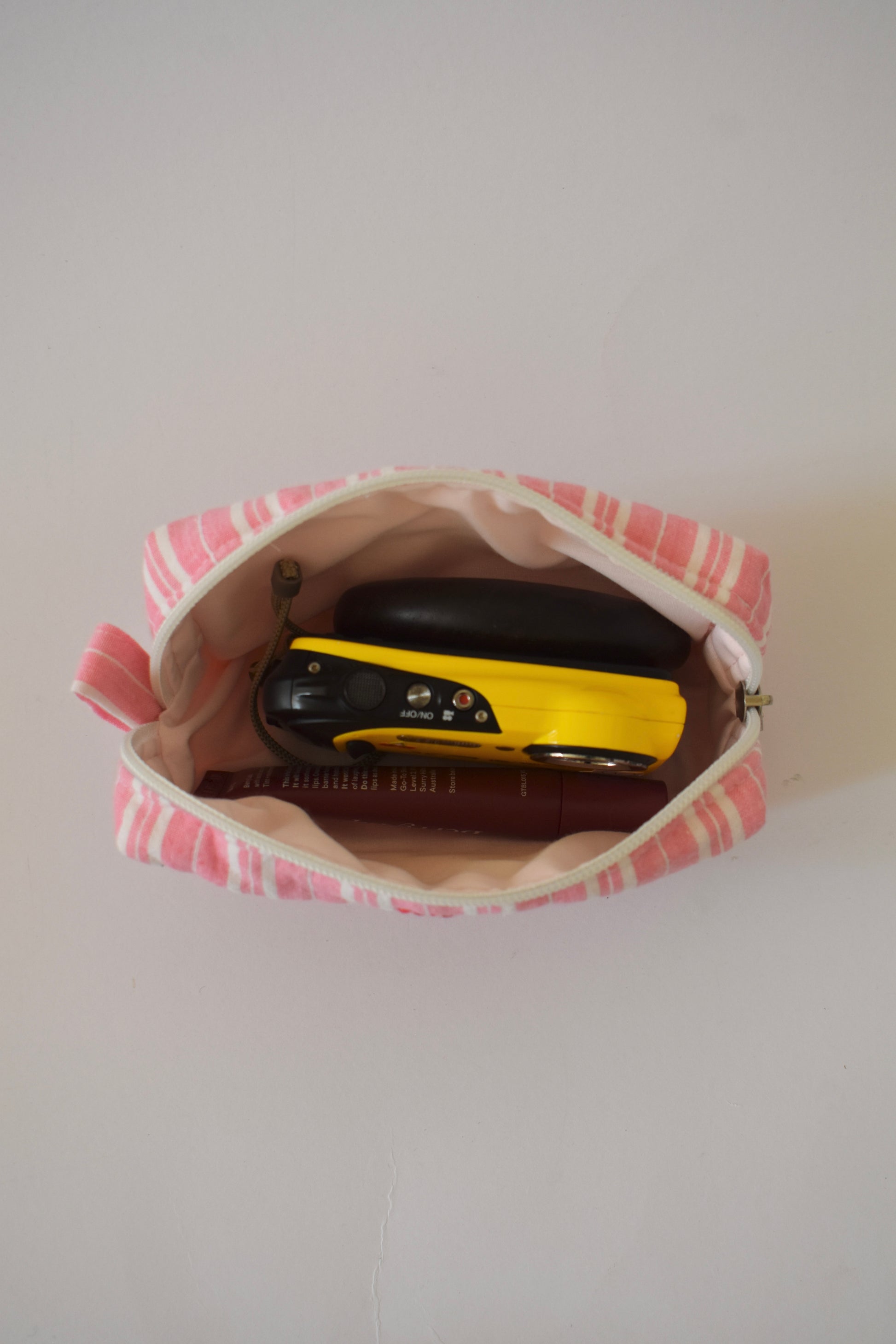 Made with up-cycled pink striped fabric and pink lining fabric.