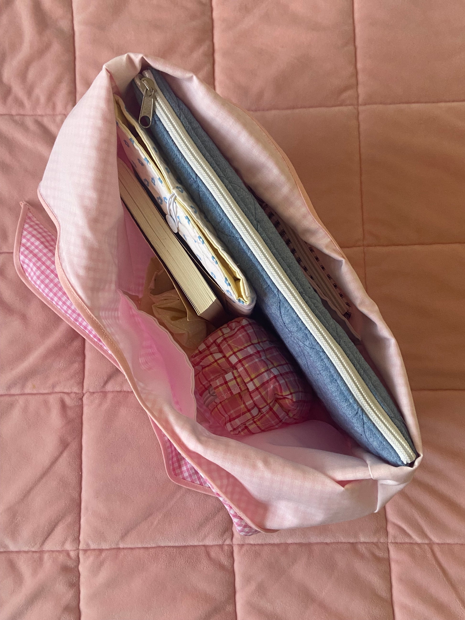 Made with vintage pink stripes fabric, lilac vintage binding , and pink lining fabric.