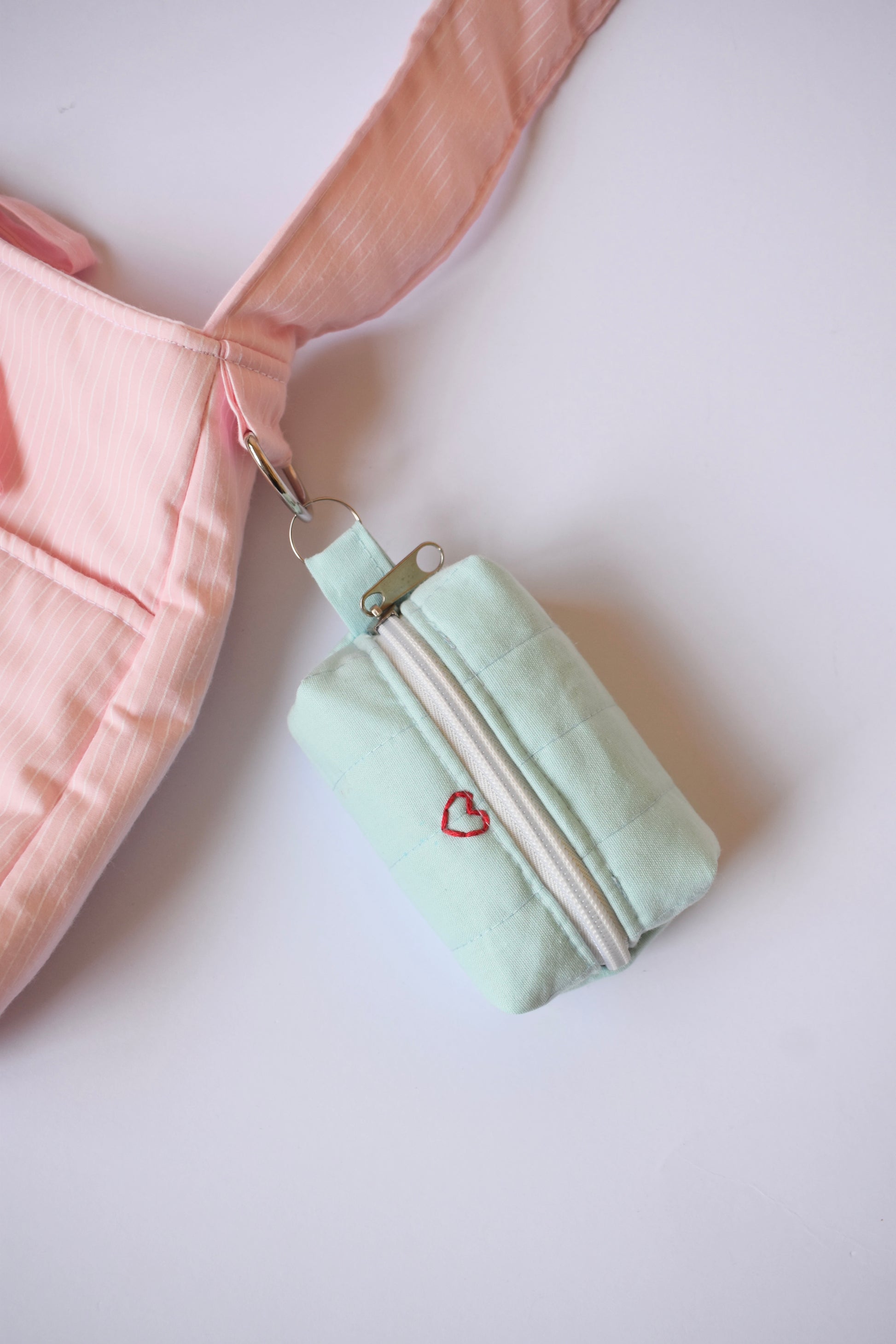 Featuring a zipper closure and a jump-ring to attach to your bag/keychain.
