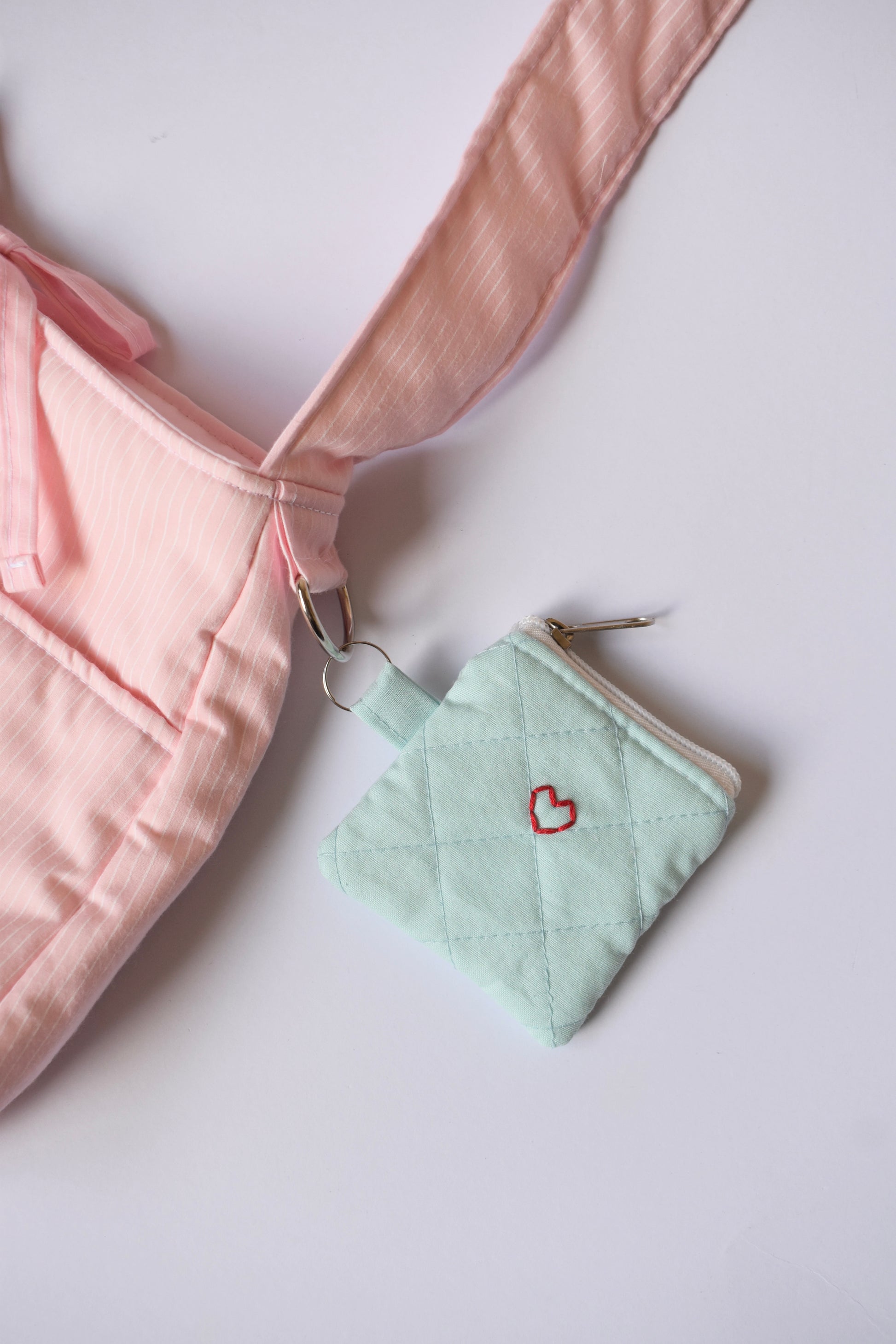 Featuring a zipper closure and a jump-ring to attach to your bag/keychain.